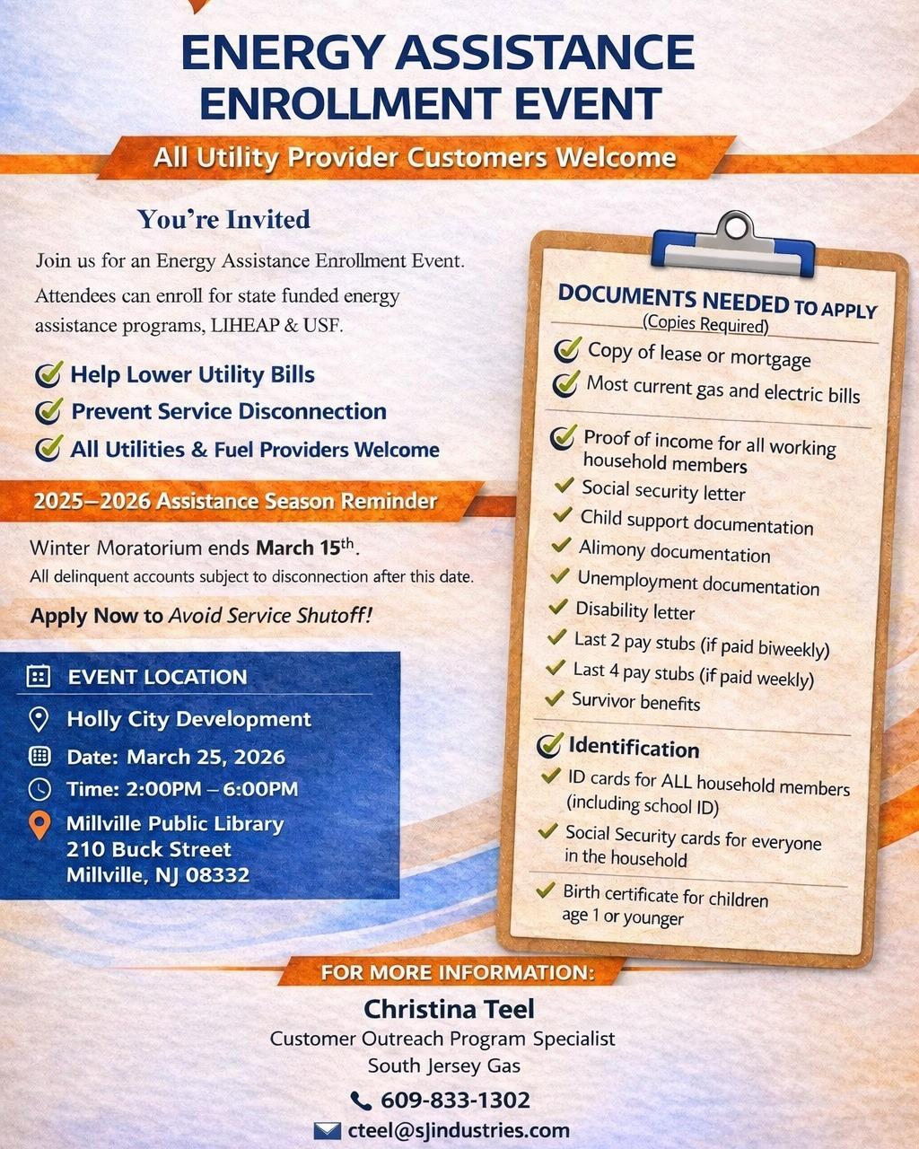 Please see below for current flyers from the City of Millville, Millville Public Library, and other community organizations. This page is updated monthly and its contents are broadcast to families each month.